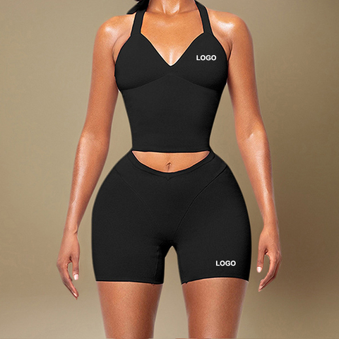 Новый дизайн логотипа, сексуальная одежда с открытой спиной, глубоким V-образным вырезом, дышащая спортивная одежда из двух предметов, жилет и шорты, устойчивый спортивный комплект для бега